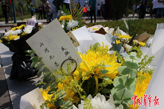 9月17日,沈阳抗美援朝烈士陵园外,观众自发送来鲜花,黄白相间的菊花花束上夹着卡片。中青报·中青网记者 郑天然/摄