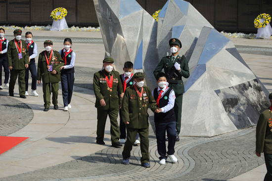观众区内,陵西小学六年级学生袁沐阳默默低下了头,向先辈默哀致意。这是他第三次参加在韩志愿军烈士遗骸安葬仪式,与之前不同的是,这次他不再是普通观众,而是担负起搀扶志愿军老兵的任务。站在爷爷们身边,袁沐阳觉得过去在书本上看到的英雄走近了,“他们为我们的今天付出青春和生命,我们更要好好学习,长大了像他们一样守护祖国。”