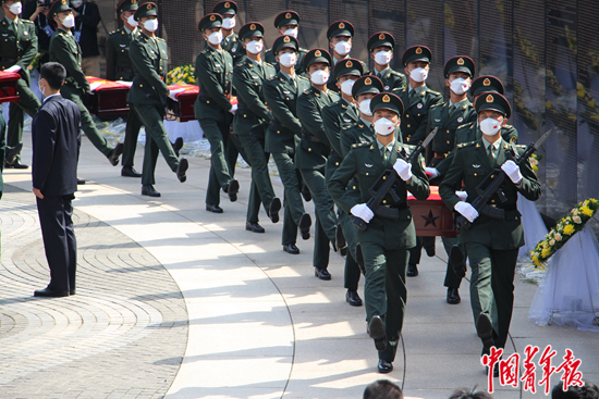 10点整,第九批在韩中国人民志愿军烈士遗骸安葬仪式正式开始。军乐队奏响婉转的《思念曲》,在解放军战士持枪护卫下,18名礼兵护送9具志愿军烈士棺椁缓缓步入现场。在摆放棺椁的礼台后,造型如连绵山脉的主题雕塑无声伫立,寓意着英雄如山,祈愿和平。