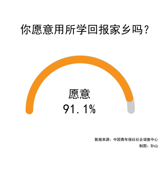 调查中,91.1%的受访青年表示,愿意用所学回报家乡。