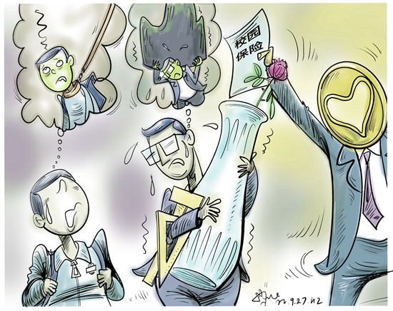 磕掉牙,摔骨折,被踩伤……学生在校园里因为参加体育运动、打闹等原因有时会发生意外伤害。专家建议,主管部门和学校可以引进第三方体育运动意外伤害保险机制,在保障学生适当活动权利的同时履行安全保障义务。(《北京晚报》9月26日)漫画:徐简