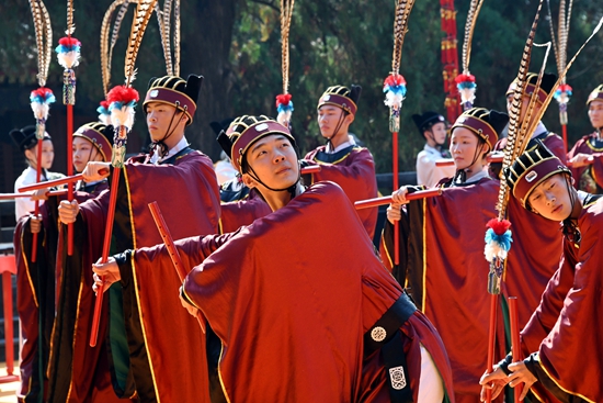 9月28日,在壬寅年祭孔大典上,工作人员在进行乐舞告祭。当日,山东曲阜举行壬寅年祭孔大典,纪念孔子诞辰2573年。新华社记者 李紫恒/摄