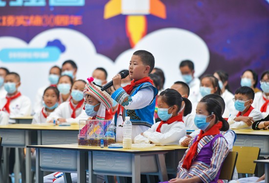 10月12日,在云南省大理新世纪中学,收看“天宫课堂”第三课的学生介绍地面种植的拟南芥生长情况。