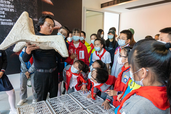 10月13日,团宜昌市委举办“凝聚青春力量 助力长江大保护典范城市建设”实践教育活动,40名优秀少先队员、青年大学生代表参观“长江大保护 可持续实践艺术展”等活动。图为艺术展策展人沈彦冰展示从长江里打捞出来的塑料做成的环保椅。黄净萍/摄 中青报·中青网记者 雷宇/文