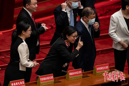 10月16日上午,北京人民大会堂,中国共产党第二十次全国代表大会开幕后,台湾省籍党代表卢丽安(前排左二)在合影结束后对着镜头做出“1”的手势。中青报·中青网记者 李隽辉/摄