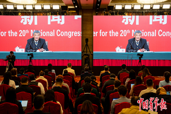 10月17日下午,党的二十大新闻中心举行记者招待会。中央纪委副书记、国家监委副主任肖培在会上介绍反腐败工作。中青报·中青网记者 李隽辉/摄