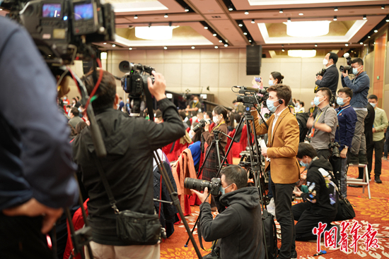 10月17日上午,中国共产党第二十次全国代表大会新闻中心举行第一场记者招待会,记者们在北京新世纪日航饭店分会场采访报道。中青报·中青网记者 李隽辉/摄