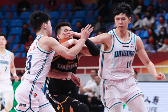 10月16日,辽宁男篮球员郭艾伦在比赛中遭遇青岛队球员刘家昕、赵嘉义的包夹防守。视觉中国供图