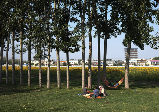 今年国庆假期,北京朝阳区,一家老小在住地附近的草坪上享受阳光。芋头/摄