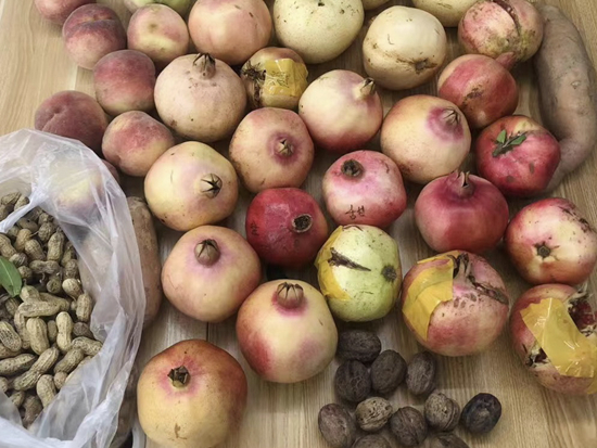 2019年10月10日收到一箱果品,一张字条写着:“甜石榴21个,酸石榴5个(石榴皮上有胶带和‘酸’字),甜梨5个,美人红桃子,地瓜2块,花生,核桃(不好看,请品尝)。”