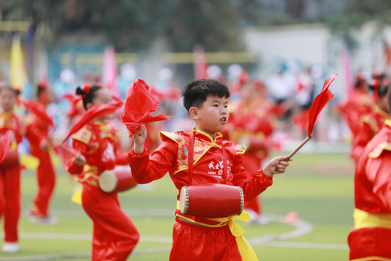 10月26日,广西柳州市,融安县实验小学的学生们在表演打腰鼓。当日,融安县实验小学教育集团举行运动会,学生们在开幕式上集中展示传统文化和民族文化教育成果。近年来,广西柳州市融安县积极开展传统乐器、地方戏剧、民族舞蹈等民族文化教育进校园活动,丰富孩子们的传统文化生活。谭克兴/视觉中国
