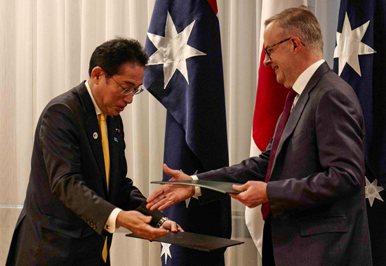 近年来,日澳两国不断加强军事捆绑。2010年,双方签署《物资劳务相互提供协定》(ACSA),并在2017年进行修订,将相互提供的后勤物资扩大至弹药领域。2012年,日澳签署《情报保护协定》。2014年,双方签订《防卫装备品与技术转移协定》。今年1月,岸田文雄与澳大利亚时任总理莫里森签署《互惠准入协定》(RAA),为两国之间相互派遣部队简化手续。
