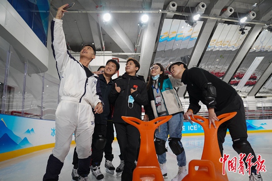 10月30日,国家游泳中心冰上运动中心,参加2022在京台湾青年研习营的学员们与冬奥冠军韩聪在冰上互动交流、合影留念。
