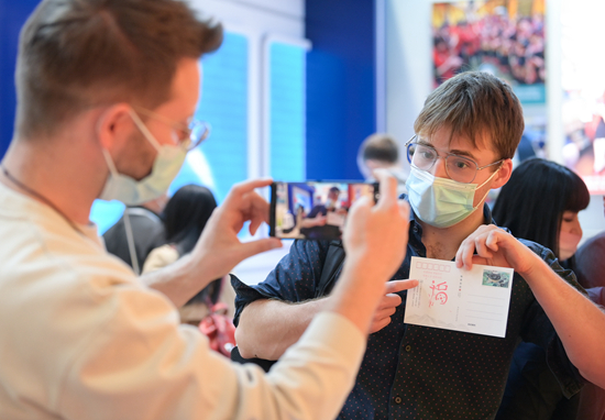 “中国取得的非凡成就令人钦佩!”一位外国嘉宾参观“奋进新时代”主题成就展时说。10月27日,这位外国嘉宾在互动体验展台前拍摄在明信片上盖的印戳。新华社记者 李贺/摄