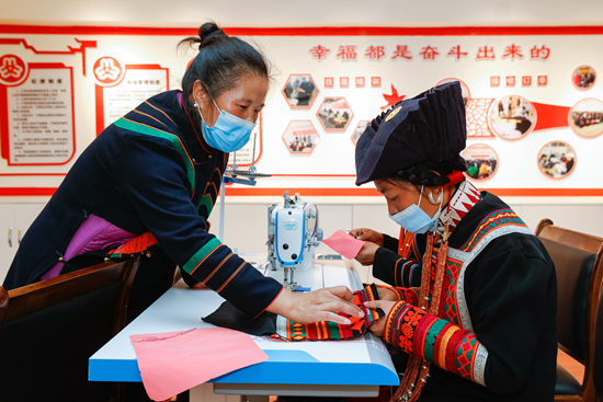10月27日,在四川省昭觉县南坪社区的彝绣工坊,易地扶贫搬迁到此的妇女在交流彝绣技艺。这个彝绣工坊有100多名绣娘,依照订单制作彝族传统服饰制品,绣娘们在此灵活就业,既能为家庭增收,又方便照顾家中老人和孩子,每年可增收数千至上万元。新华社记者 沈伯韩/摄