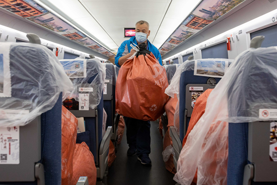 11月1日,在G1373次列车上,铁路工作人员搬运货物。当日,铁路“双11”电商黄金周运输服务启动,将持续至11月20日。新华社记者 王翔/摄