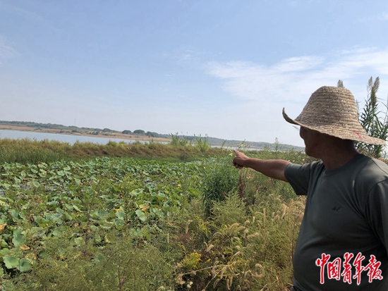 方若柏站在自家池塘前,介绍青头潜鸭栖息处。中青报·中青网记者 朱娟娟/摄