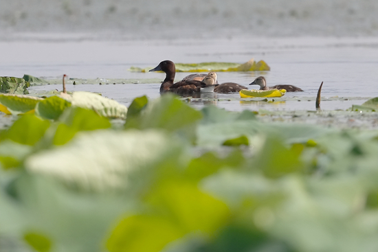 2019年8月,志愿者在方若柏家池塘拍摄的“青头潜鸭带雏鸟”景象。郎伟钢/摄