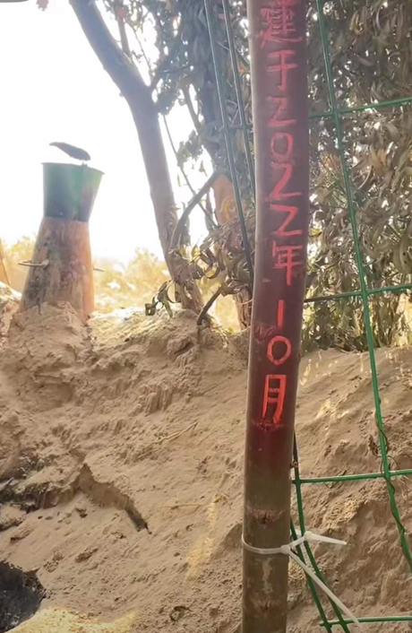 离开黄河滩那一天,男人们回头看了地窝坑好几眼,陈晴哭了。她拿起手机循着窝棚拍了最后一圈,这时发现,墙皮外侧原本柔软的绿色柳枝已经干枯,或许因为坑窝里温度高,土缝里长出几根小草,已有两厘米高。在土窝房一根发红的木桩上,陈晴丈夫刻下的这行字很显眼,“建于2022年10月”。
