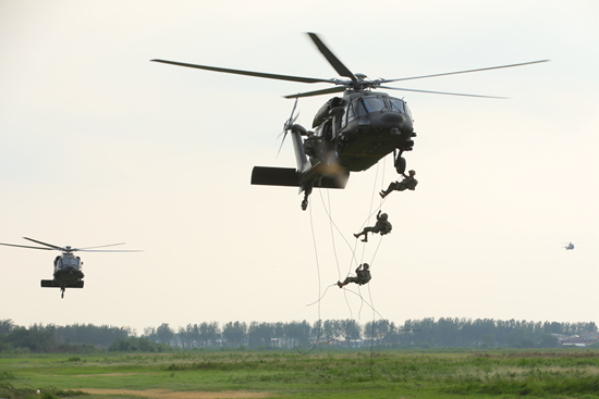 连日来,第83集团军某空中突击旅开展空地协同训练,锤炼官兵实战化本领。图为官兵正在进行一机多绳机降训练。 徐君强/摄