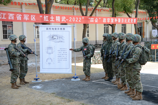 党的二十大召开后,江西省军区组织“红土精武·2022”群众性练兵比武竞赛,引领广大官兵和民兵积极投身练兵备战。图为官兵们正在开展“四会”教学室外课目比武竞赛。卢成行/摄