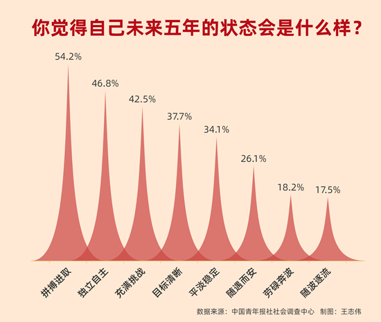 调查显示,对于未来5年的生活状态,54.2%的受访青年认为会是拼搏进取的,46.8%的受访青年感到会是独立自主的,42.5%的受访青年觉得是充满挑战的。
