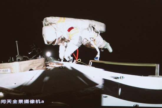 11月17日在北京航天飞行控制中心拍摄的神舟十四号航天员蔡旭哲成功出舱的画面。