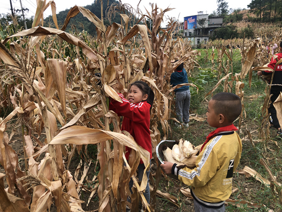 木杉小学的学生在“试验田”里掰玉米。受访者供图