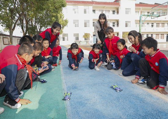 11月8日,江西吉安,吉州区长塘镇桥南小学的孩子们在校园进行御风赛车模型比赛。视觉中国供图