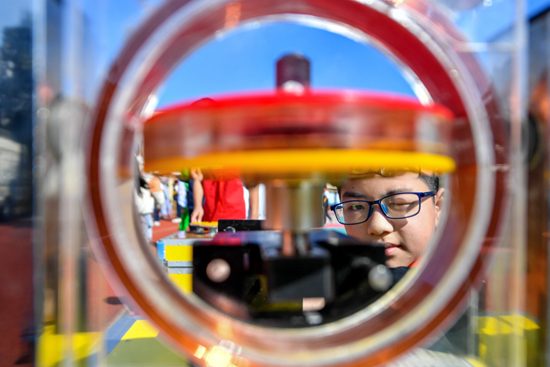 前不久,浙江湖州,长兴县蓝天学校,学生们正在体验“旋转磁体“科技展品。