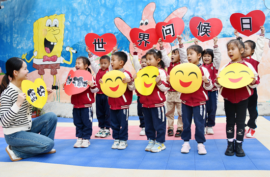 11月21日,湖南省永州市江永县中心幼儿园的小朋友在老师的指导下学习使用问候用语。当日是“世界问候日”,一些学校举行丰富多彩的主题活动,通过多种方式引导孩子们养成和善、文明的行为习惯。田如瑞/摄(新华社发)