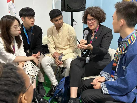 在儿童和青年角,清华大学水利系博士生谢宗旭向帝国理工大学格兰瑟姆气候变化与环境研究所政策与翻译主任艾莉莎·吉尔伯特介绍自己的家乡贵州在生态环境治理上的进展,以及贵州青年是如何参与气候变化行动的。