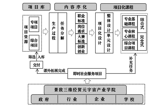 借鉴“能力本位”理论和“服务发展”理念,进行动漫制作技术专业方向凝练,以元宇宙场域下对高效建模人才的需求为导向,以学生高质量职业能力培养为主线,改“简单应用”为“解决复杂问题”,将“岗课赛证创”深度融合,实现“需求导向、能力本位、学用一体”的整体化教学模式。元宇宙人才培养基于产业学院建设,强调信息技术服务专业群的“服务能力”,重点打造两个体系和一个能力:打造“岗课赛证创”教学体系、打造以学生为中心的立体考核评价体系,赋能元宇宙+产业的服务能力。以培养高效建模人才为目标,建立“岗课证赛创”融合人才培养框架。以学生胜任岗位工作的综合能力培养为主线,采用不同形式对元宇宙企业开展广泛的社会调研,以工学结合、双元培育为切入点和突破口,采用项目导向、任务驱动等形式,强化学生专业核心素养的培养,对理论、实践教学的内容、形式等方面进行深层次的教学改革。针对数字时代产业迭代升级,建立“项目资源”动态更新机制。教师将各类项目按照综合程度分类入库,依据职业、岗位、大赛等标准进行选取、序化内容,进行项目化设计。即时承担的服务项目,先由师生团队课外实践拓展完成,部分工作任务作为补充即时融入教学,项目验收后经过筛选入库,及时更新过时项目,实现循环使用。