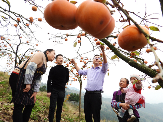 11月20日,在四川省达州万源市魏家镇熊家坝村种植园内,来自浙江省舟山市普陀区的帮扶干部(左三)在给果农培训阳丰脆甜柿子种植技术。邓良奎/摄(新华社发)