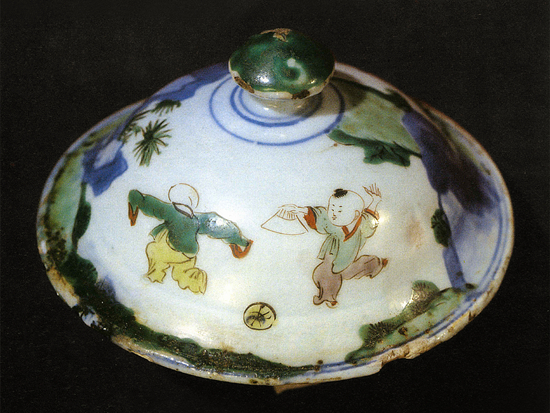 明清瓷器流行儿童游戏纹饰,童子蹴鞠成为瓷面主要取景之一。中国体育博物馆收藏有清代五彩蹴鞠图高足碗,碗面外壁绘有7个儿童蹴鞠的图景,正中一童子用力甩动双臂准备抬腿踢球,另一童子欲接球,还有5个玩伴在旁边加油助威。法国巴黎吉美国立亚洲艺术博物馆亦收藏有景德镇窑烧制的清代童子蹴鞠青花瓷盘,盘底部有3个童子蹴鞠游戏的场景。