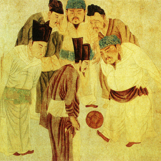 徽宗时期的御用画家苏汉臣为了给赵佶热爱蹴鞠提供历史论据和家族渊源,曾绘制一幅《宋太祖蹴鞠图》,描摹了太祖太宗兄弟和赵普、石守信、楚昭辅、党进四位文武大臣一起蹴鞠的场景。画中,赵匡胤正在用脚尖踢球,赵普撩起衣角作势接球,赵光义等人在后观看。这幅描摹宫廷君臣活动的特殊画作,不见君庄臣恭的威严,只有君臣同乐的祥和闲适。《宋太祖蹴鞠图》传递出的不仅是当时蹴鞠运动的团队精神,更是北宋君臣共治天下的治国理念。只可惜随着王朝兴替,苏汉臣的原画不知所踪,只留下元人钱选的临摹图,现收藏于上海博物馆。