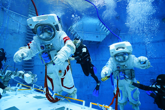 在圆形的模拟失重水槽中,航天员穿着数百公斤的水下服悬浮在蓝色的深水中,潜水员们在一旁辅助,媒体捕捉的画面似乎特别炫酷浪漫,但对其中的航天员来说,体验并不一样。