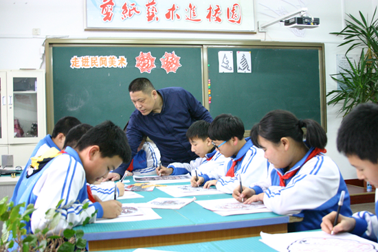 该校今年50岁的美术教师刘亮在自己读初中时就是美术课代表。也是在那时,刘亮对中国民间剪纸艺术产生了浓厚的兴趣,并开始进行剪纸创作和研习,常常给身边的同学制作剪影,完成一个人物的侧面剪影,最快只需要5分钟。