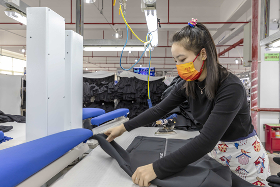 11月25日,员工在贵州省黔西市岔白工业园区一家服饰公司生产车间加工服装。
