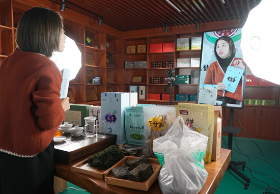 在陕西省安康市平利县八仙镇一家茶叶公司,电商主播在介绍茶叶产品(10月21日摄)。