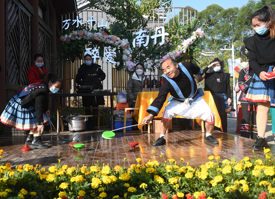 12月15日,表演人员在广西河池园博园给游客展示打陀螺。当日,第十三届广西(河池)园林园艺博览会在河池市宜州区开幕。新华社记者 陆波岸/摄