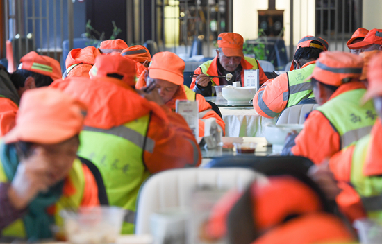 当日是冬至,陕西省西安市新城区西一路街道工作人员对接爱心企业,为环卫工人送上水饺,传递冬日温暖。邹竞一/摄(新华社发)