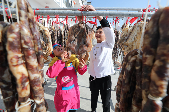 12月22日,安徽省黄山市徽州区西溪南镇东红村村民在晾晒风干腊肉。冬至时节,人们忙着制作、晾晒腊肉、腊肠、鱼干等地方特色传统食物,供应节日市场。樊成柱/摄(新华社发)