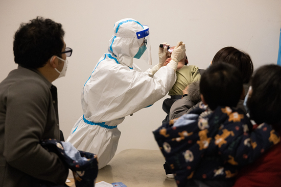 12月27日,在上海交通大学医学院附属新华医院儿科发热门诊,医生陈旭婷在检查患儿状况。