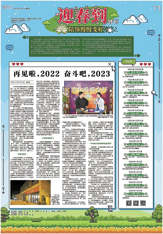 本报今日推出“陪你慢慢变好·迎春到”特刊,希望通过这场联播活动和报纸特别策划,倡导一种新的生活和消费方式,与亿万青年同频共振,更好地链接虚拟与真实、当下和远方、现实和未来、烟火和理想,陪伴大家一起活力满满地喜迎新春,慢慢变好!
