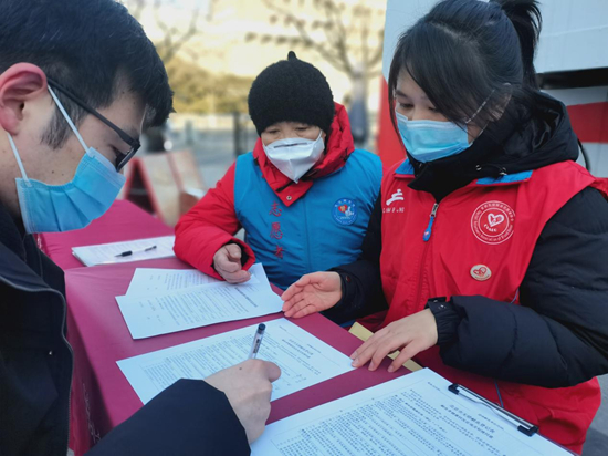 近日,安徽驻京团工委组织志愿者在前门首都无偿献血站,开展“热血接力迎新年 奋进新征程”志愿服务活动。图为志愿者在指导献血者填写知情同意书。安徽驻京团工委供图