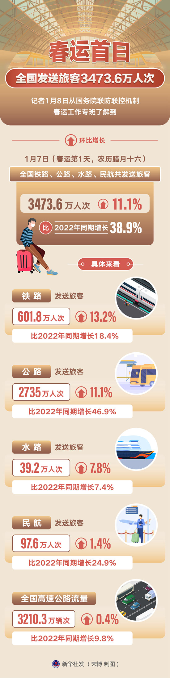 记者1月8日从国务院联防联控机制春运工作专班了解到,1月7日(春运第1天,农历腊月十六)全国铁路、公路、水路、民航共发送旅客3473.6万人次,环比增长11.1%,比2022年同期增长38.9%。宋博/制图(新华社发)