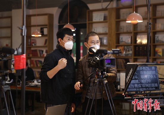 1月3日,北京,青年书店“陪你慢慢变好·迎春到”跨年可视化联播演播室,于冰(右)和同事在工作中。中青报·中青网记者 陈剑/摄