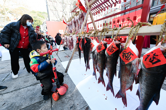 1月11日,浙江省杭州市余杭区瓶窑镇瓶窑老街年货节上展示着鲢鱼、土猪肉等特色年货。