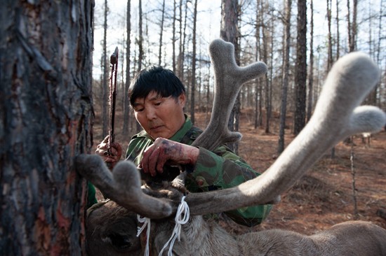 达瓦、郭芳夫妇的猎民点位于内蒙古根河市金河镇附近的原始森林腹地,2003年根河市实施生态移民后,他们是为数不多选择留在山里的家庭。夫妻俩饲养了近200头驯鹿,每年春季是鹿茸集中收获的季节,达瓦会选个好日子,开始为期10余天的割茸工作。公鹿每年能割两次,母鹿茸角长得慢,通常只割一次。